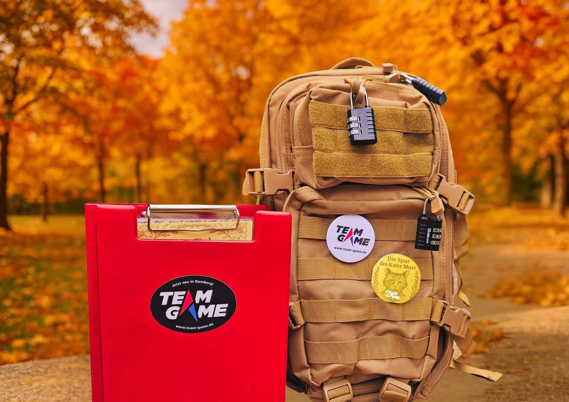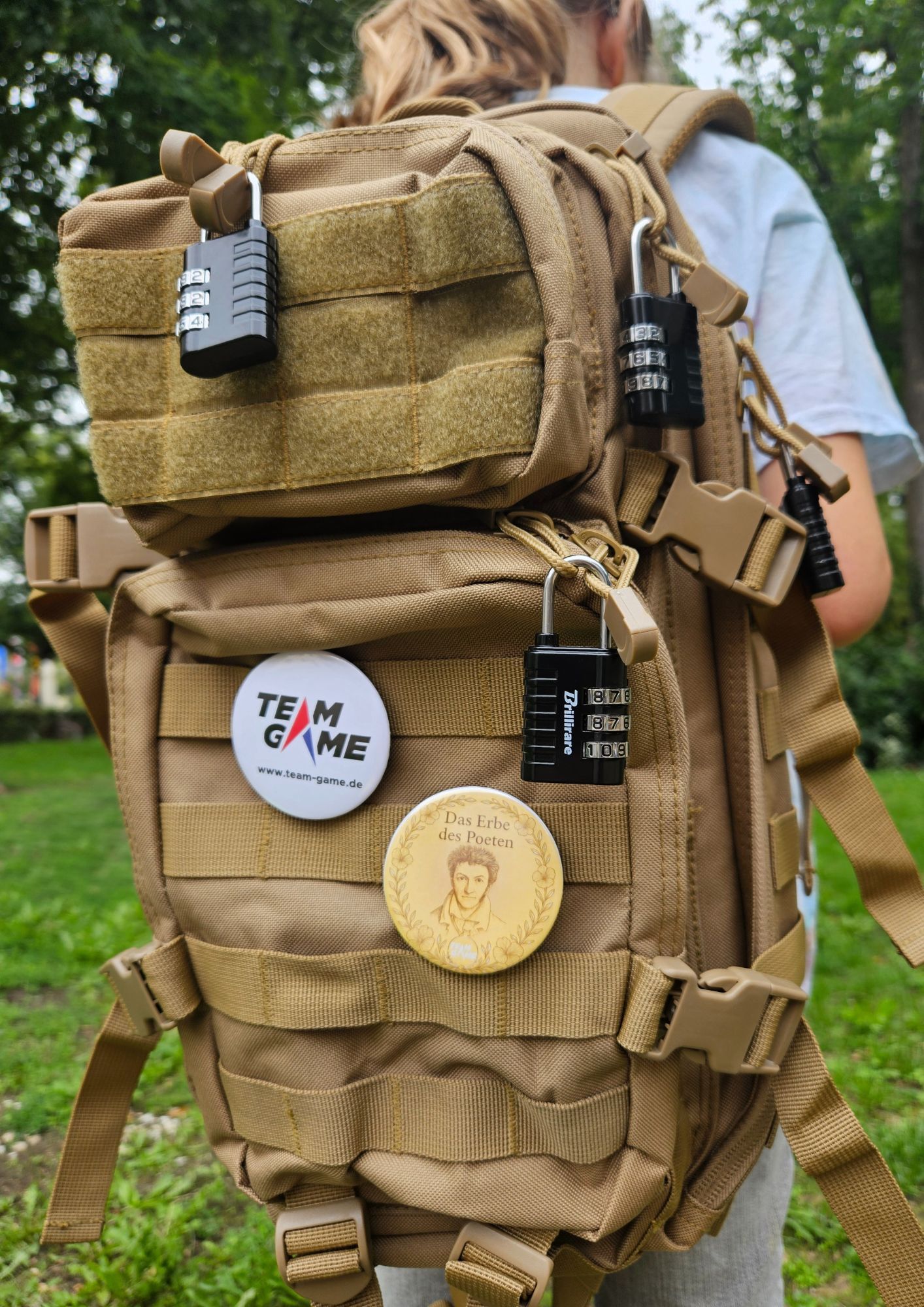 Rätselrucksack mit 6 Schlössern. Nur mit scharfer Kombinationsgabe könnt ihr die Fächer des Rucksacks öffnen, um an die nächsten Hinweise und Rätsel zu gelangen.